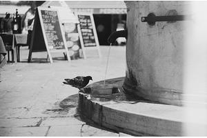 A pidgeon drinking water from a fountain in Venice, Italy.