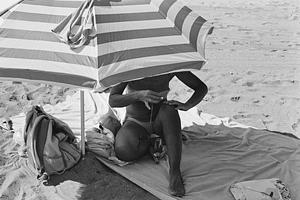 Woman painting her nails at the beach.